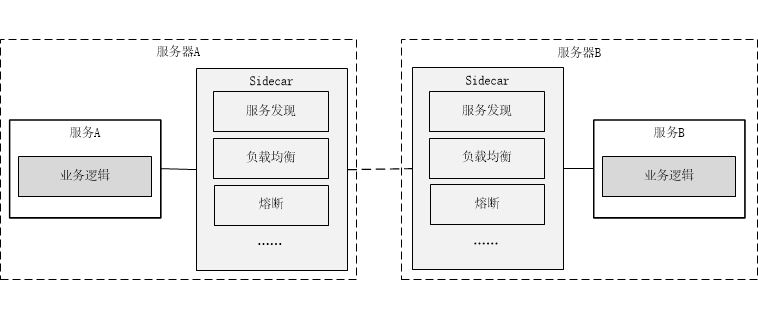 这就是典型的Sidecar代理模式,也被翻译为边车代理,它作为与其他服务通信的桥梁,为服务提供额外的网络特性,并与服务独立部署,对服务零侵入,更不会受限于服务的开发语言和技术栈,如下图所示: