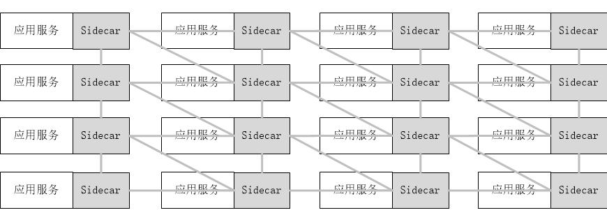 把Sidecar模式充分应用于一个庞大的微服务架构系统,为每个应用服务配套部署一个Sidecar代理,完成服务间复杂的通信,最终得到一个如下所示的网络拓扑结构,这就是Service Mesh,又称之为“服务网格”。